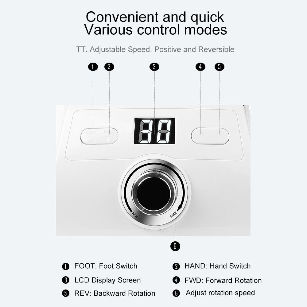 This machine is 35,000 RPM for maximum strength and speed. Safe for natural nails and enhancements. Quiet and low vibration design for comfort grip and safe usage.