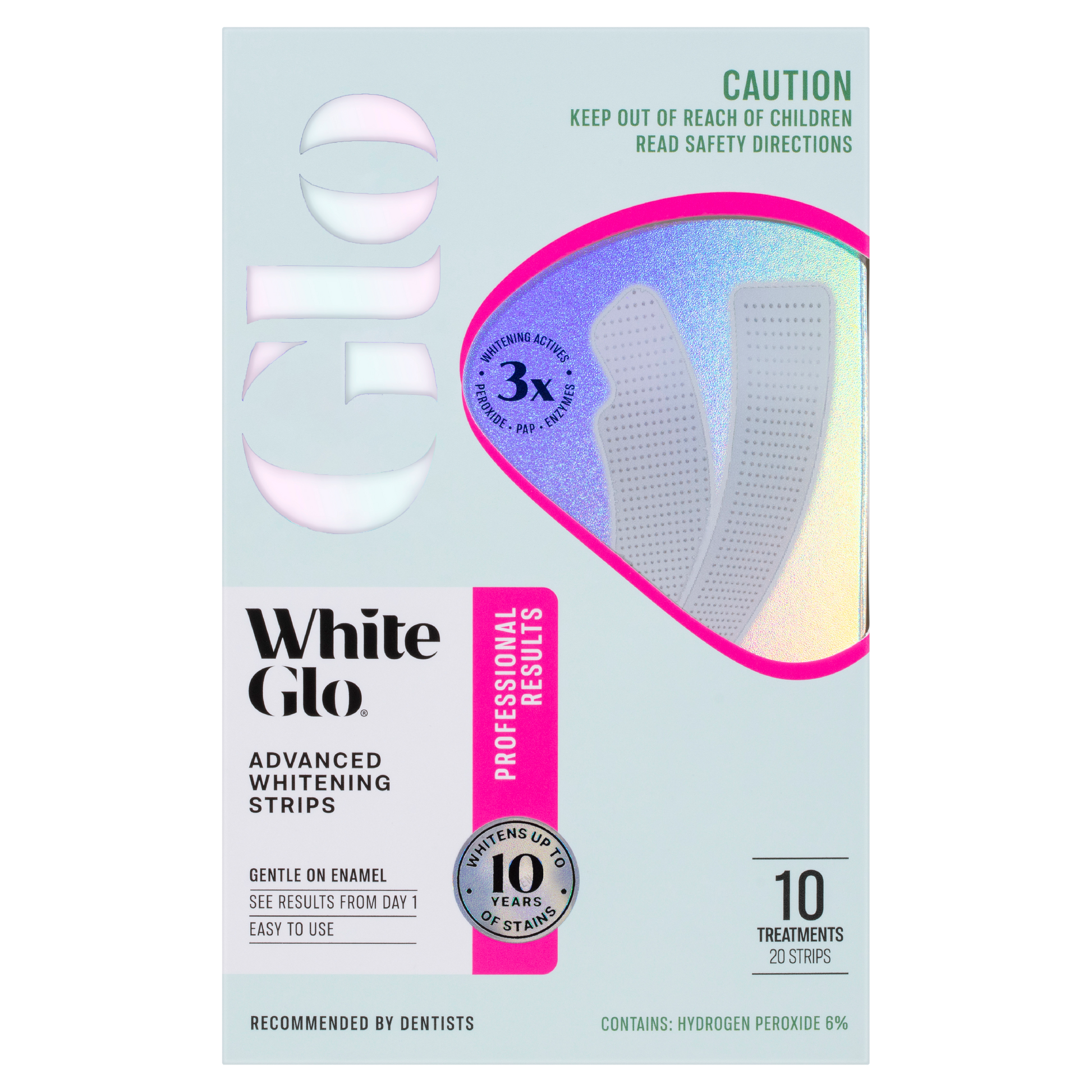White Glo's Advanced Whitening Strips will give you professional results in the comfort and convenience of your own home. Each strip contains 3 advanced active whitening ingredients to deliver you an even more impressive whitening result. This exclusive formulation has been developed by Australian Cosmetic Dentists and incorporates peroxide, PAP and Natural Enzymes to target tough stains caused by general aging, coffee, wine or smoking.